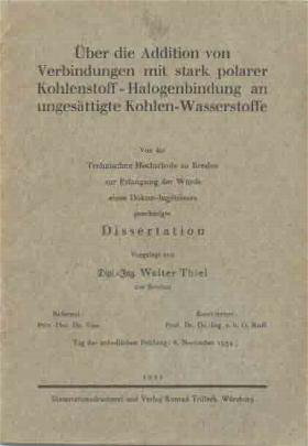 In 1934 his thesis ”About the addition of compounds with strong polar carbon-halogenous-bonds in unsaturated hydrocarbons“ (“Über die Addition von Verbindungen mit stark polarer Kohlenstoff-Halogenbindung an ungesättigte Kohlen-Wasserstoffe“) received the highest possible honor (summa cum laude).